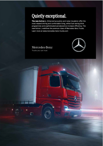 Quietly exceptional The new Actros L Enhanced acoustics and noise insulation offer the most relaxed driving and comfortable living whilst fuel-saving drive programmes and sophisticated aerodynamics increase efficiency The new Actros L redefines the premium class of Mercedes-Benz Trucks Food Served 24h (Sun to Fri) Learn more at www mercedes-benz-trucks com 24h contents